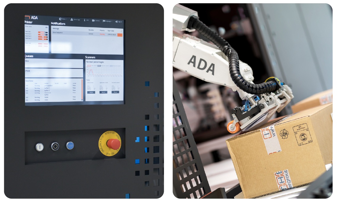 Beim Transport eines Kartons zur Maschine wird dieser gescannt, um festzustellen, welche Dokumente (Lieferschein, Versanddetails etc.) gedruckt und zwischengespeichert werden müssen. Die ADA-Maschine beginnt sofort mit dem Drucken vorgefertigter Versanddokumente. Mehrere Seiten werden bequem gefaltet. Ein Roboterarm nimmt die gestapelten Dokumente auf und schneidet die Deckblattfolie in einem Arbeitsgang ab. Die ADA-Maschine bringt die Dokumente je nach Kartontyp an einer der vorprogrammierten Positionen an – entweder an der Seite oder auf der Oberseite des Kartons. Die ADA-Maschine stellt stets sicher, dass die Dokumente außen am Karton gut sichtbar und leicht zugänglich sind.