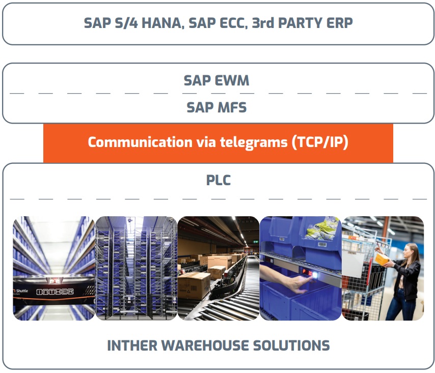 Um die nahtlose Integration der Materialflusstechnik von Inther in SAP EWM zu ermöglichen, nutzt Inther EWM das SAP Material Flow System (SAP MFS). SAP MFS ist eine Standardkomponente von SAP EWM und dient der direkten Steuerung automatisierter Lagersysteme ohne Zwischensoftware wie ein externes Lagerverwaltungssystem. SAP MFS kommuniziert direkt mit der Maschinensteuerung (SPS). SAP MFS verwendet Standard-Telegrammkommunikation (TCP/IP) und bietet Echtzeit-Leistungsüberwachung, Fehlererkennung und verbesserte Synchronisierung zwischen Lagersoftware und -hardware.